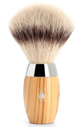 Elegant and modern sleek design. Robust shaving brush made of synthetic hair. The handle is made of olive wood and chrome-plated metal.